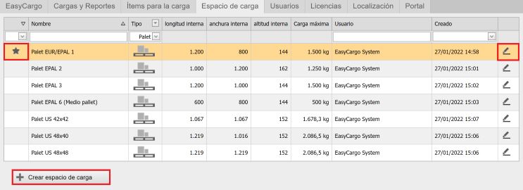 Todo lo mencionado se puede hacer en la pestaña «Espacio de carga». Al hacer clic en la estrella de la primera columna, el pallet se añadirá a tus favoritos; en la lista de espacios de carga, aparecerá en la parte superior para que no tengas que buscarlo cada vez.